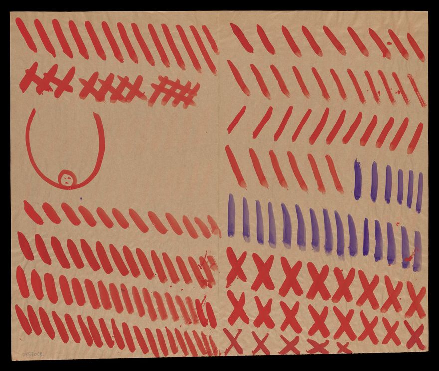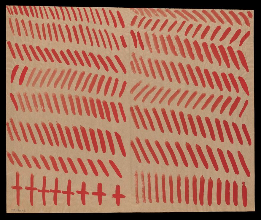 Credit: Red diagonal lines, crosses, and grids, purple and red vertical lines, and rounded shape in red. Source: Wellcome Collection.