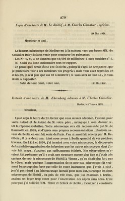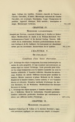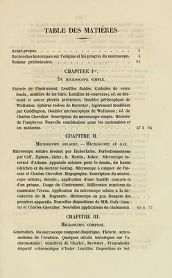 Des microscopes et de leur usage : description d'appareils et de procédés nouveaux, suivie d'expériences microscopiques puisées dan les meilleurs ouvrages anciens et les notes de M. Le Baillif, et d'un mémoire sur les diatomées, etc. par M. De Brébisson / manuel complet du micrographie par Charles Chevalier.
