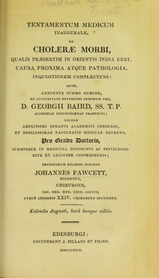 Tentamentum medicum inaugurale, de cholerae morbi, qualis praesertim in orientis India erat, causa proxima atque pathologia, inquisitonem complectens ... / eruditorum examini subjicit Johannes Fawcett.