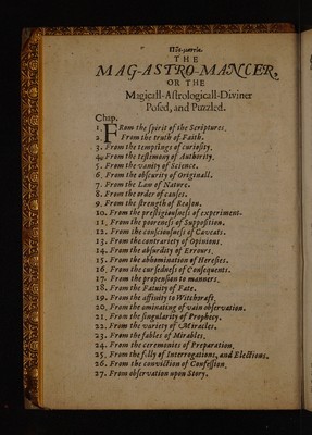 ![Ss eae SW OSES roy - ie yy aN FA SA Fa? TEN Lf oY? ay o Bid mt e : ce a Nera i a a ae ee PN PELLET, CONE LONE E00 ET T1i¢-peayria. | | | + a EB ie : : ‘OR THE ee Magicall-Aftrologicall-Diviner L Pofed, and Puzzled. | Chap. 7 | 1.) Rom the (pirit of the Scriptures, | oe From the truth of Faith. i 3. From the temptings of curiofity, 4 From the teftimony of Authority, 5. From the vantty of Science. | 6, From the obfcurity of Originall. | | 7. From the Law of Nature. 3 | 8. From the order of cafes. 1 9. From the ftrength of Reajon. 7 10. From the preftizionf{ne/s of experiment. 12. From the.confcioufne/s of Caveats. 13. From thecontrariety of Opinions. | 14. From the abfurdity of Errours., | 15. From the abhomination of Herefies. 16, From the cur fednefs of C onfequents. 17. From the propenfion to manners. | 18. From the F atuity of Fate. ‘| 19. Frons the affinity to Witcharaft. 20, From the ominating of vain obfervation. | 21, From the fingularity.of Prophecy. i] 22. From the variety of Miracles, 23. From the fables of Mirables, 24. From the ceremonies of Preparation, 25, From the fully of Interrogations, and Elections, 26. From the conviction of Confelfion, , 27. From obfervation upon Story. i](https://iiif.wellcomecollection.org/image/b30328962_0002_0026.jp2/full/800%2C/0/default.jpg)