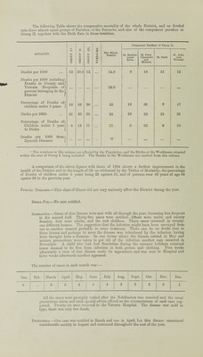 ![To the Urban Sanitary Authority of the City of Winchester. Report of the Medical Officer of Health for 1895. .Gentlemen, The following is my Annual Report for the year 1895, and I submit it with the greater satisfaction as it gives a most favourable record of the health of the District. Appended to it is a report of the proceedings and expenditure at the Victoria Hospital, and there is also a statement of the work done in Mr. Piper’s department. The Population of the District which in 1894 was estimated at 18,952 is considered to have diminished for 1895 to 18,216. This decrease is partly accounted for by a known reduction of the average strength at the Barracks, and by a decrease in the population in the surrounding parishes estimated to have taken place, from a careful comparison of the birth and death rate of 1895 with those of previous years. Tables A. and B. are appended and are similar to those of previous years. The deaths in 1895 amount to 270. Of these deaths 2 were at the Barracks and 87 at the Union Workhouse. 15 of the latter belong to the Urban, and 22 to other Districts. During the year'll occurred at the County Hospital, and 2 at the Victoria Hospital, of persons belonging to the District, which are not included in the Tables : both these Institutions being situated within the area of the Rural Sanitary District. Taking the grouping of Table A, the deaths in the District occurred at the following ages :— Deaths under 1 year of age • • • 49] 99 over ,, 99 and under 5 years ... 13| 99 „ 5 9 9 „ 15 „ « • • 8) 9* „ 15 9 9 ti 25 ,, 10 99 „ 25 9 9 „ 65 „ 87 9 9 ,, 65 9 9 • • • 1031 It is of interest to note that 17 deaths took place between 80 and 85 years of age, 9 between 85 and 90, 2 at 92 and 2 at 93. The Registered Births were 444, being 46 below those of the previous year. The following Table shows how the Births and Death, and Deaths from Zymotic Diseases were distributed in 1895. LOCALITY. GROUP. I.* GROUP Il.t GROUP I Il.t BARRACKS. WORK- HOUSE. The Whole District. Area in Acres ... • • • • • • • • • A. R. 1043 2 Population, Census, 1891 5850 6388 5619 1216 Included in Group I. 19073 ,, Estimated for 1895 5710 6493 5659 354 9 9 18216 Persons to Acre ... ... ... • • • • • • 17.44 Total Deaths 70 90 71 2 37 270 Deaths from 7 principal) Zymotic Diseases j 2 6 2 ... 1 11 Total Births 127 171 132 14 Included in Group I. 444 ° Group I.—The Parishes of St. Thomas, Weeke, and part of Chilcomb. f Group II.—The Parishes of St. Bartholomew Hyde, St. Peter Cheesehill, Milland, St. Faith, St. John and Winnall. % Group III.—The Parishes of St. Maurice, St. Mary Kalendre, St. Lawrence, St. Swithun, St. Michael, and St. Peter Colebrook.](https://iiif.wellcomecollection.org/image/b30282287_0001.jp2/full/800%2C/0/default.jpg)