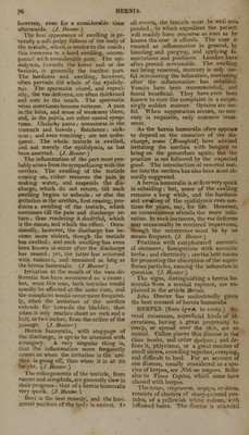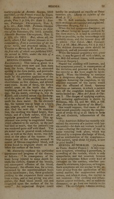 ![ro-clarurgiche di Antonio Scarpa, 1809 and 1810 ,• or the French transl. by Cayol, 1812. Richer and a JYosographie Chirur- gicule, Tom. 3. p. 354, &c. Edit. 2. Las- tua, Puthologie Chirurgicule, Tom. 1, p. 1, &c, Edit. 1809. Pelletdn CUnique Chirurgicale, Tom. 3. Travers on Inju- ries of the Intestines, &c. 1812. LeveUle, A'ouvelle Doctrine Chirurgicale, Tom. 3, p. 170, csV. 1812. But, above all, the •work, which J feel infinite pleasure in re- commending, ft om a comriction of its sw- perior merit, and practical utility, is a Treatise on Hernia by W. Lawrence ; 8tw. the first edit, of which was published ISO, the second in 1810, under the title of a Treatise on Ruptures. HERNIA CEREBRI. (Fungus Cerebri. Encephalocele.) This name is given to a tumour winch every now and then rises from the brain, through an ulcerated opening in the dura mater, and protrudes through a perforation in the cranium, made by the previous application of the trephine. Mr. Abernethy has made some observations on this disease, and related some cases. In one of these, the hernia cerebri arose on the tenth day after trephining, and was as large as a pigeon's egg; the pia mater, covering it, was in- flamed ; and a turbid serum was discharg- ed at the sides of the swelling, from be- neath the dura mater. On the eleventh day, the tumour was as large as a hen's egg, smooth, and ready to burst. The man died the next day. On examina- tion, the swelling was found larger, than before, and of a dark colour, with an ir- regularis granulated surface. This ap- pearance was owing to coagulated blood, which adhered to its surface, as the part had bled so much, that the patient's cap was rendered quite stiff with blood. The pia mater was in general much inflamed, and, as well as the dura mater, was defi- cient at the place of the tumour. The deeper part of the swelling seemed to consist of fibrous coagulated blood, and it was found to originate about an inch below the surface of the brain. Mr. Abcrnethy explains the particular appearance and progress of the disease, as follows: In consequence of the brain being injured to some depth be- neath the surface, disease of the vessels, and consequent elfusion of the blood, had ensued ; the effusion was, for a time, restrained by the superincumbent brain and its membranes ; but, these gradually yielding to the expansive force exerted from within, and at last giving way alto- gether, the fluid blood oozed out and congealed upon the surface of the tu- An organized fungus could hardly be produced so rapidly as these tumours are. (Essau on injuries of the Jhud, p. 37.) Mr. C. Bell contends, however, that such swellings are vascular and organized. (Operative Surgery, Vol. 1.) When the bad symptoms di.fflppenr. on tha uitnour being no longer confined by the dura mater, it is best to interfere as little as possible, as the hemorrhage will probably cease, and the tumour drop off in pieces (See Edinb. Med. Comment. Vol. I.p. 98. Med. Museum, Vol. A.p. 463.) The mildest dressings alone should be employed, and all pressure avoided. When the tumour acquires a very great size, it may be pared off with a knife, as Mr. Hill did several times, with success. (Cases in Surgery.) Should the swelling still increase, and bad symptoms prevail, in consequence of the irritation and pressure on the brain, the opening in the bone ought to bo en- larged. Were the bleeding to continue in a dangerous degree, Mr. Abernethy suggests removing the coagulum, to try whether exposure of the cavity would stop the effusion* of blood. Quesnay mentions an instance, in which a patient tore off' the coagulum himself, and the cavity healed up; Mem. de I'Acad, de Chir. torn. 1. The danger of applying styptics, and irritating applications is shewn by Hildanus, Obs. 14, and Mr. Hill, p. 198. (See Abernethy on Injuries of the Head.) One would suppose, that cases of this kind would generally require the employ- ment of every thing at all likely to keep oft, and diminish, inflammation of the brain. [The American Editor has recently wit- nessed the recovery of a patient with her- nia cerebri—he does not venture to call it a cure.—During the existence of the tu- mour vomiting took place, which was followed by a copious discharge of blood, and an amelioration of the symptoms.— The patient, aged about 12 years, is now in good health.] HERNIA HUMORALIS. (Infamma- tio 7'cstis. Swelled Testicle.) A very com- mon symptom, attending a gonorrhoea, is a swelling of the testicle, which is only sympathetic, and not venereal, because the same symptoms follow every kind of irritation on the urethra, whether pro- duced by strictures, injections, or bougies. Such symptoms are not similar to the ac- tions arising from the application of ve- nereal matter, for suppuration seldom occurs, and when it does, the matter is not venereal. The swelling and inflam- mation appear suddenly, and as suddenly disappear, or go from one testicle to the other. The epididymis remains swelled,](https://iiif.wellcomecollection.org/image/b21110670_0103.jp2/full/800%2C/0/default.jpg)