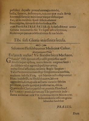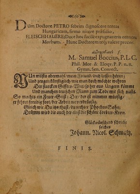 Credit: Febrim militarem, quae vulgo Morbus Hungaricus vocatur, ... / sub praesidio Georgii Christophori Petri, ... Submittit Salomon Fleischhauerus, ... Ad diem 10. Februarii, Horis & locô consuetis. Source: Wellcome Collection.