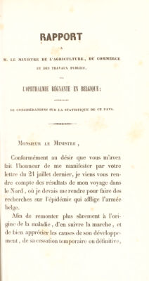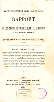 Ophthalmie des armées. Rapport à M. le Ministre de l'Agriculture, du Commerce et des Travaux Publics sur l'ophthalmie régnante en Belgique, accompagné de considérations sur la statistique de ce pays / [Paul Louis Balthazar Caffe].