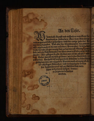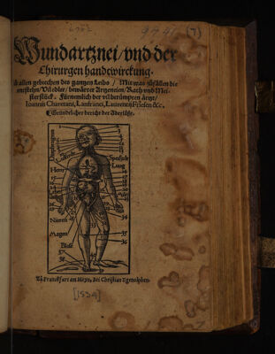 Wundartznei, und der Chirurgen Handtwirckung. Zu allen Gebrechen des gantzen Leibs, mit was Zufällen die entstehn, vil edler, bewärter Artzeneien, Rath und Meisterstück / Fürnemlich der vil berümpten Ärtzt, Joannis Charetani, Lanfranci, Laurentii Friesen, etc. Gründtlicher Bericht der Aderlässe.