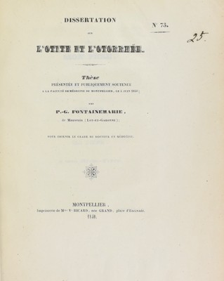Dissertation sur l'otite et l'otorrhée : thèse présentée et publiquement soutenue à la Faculté de médecine de Montpellier, le 5 juin 1840 / par P.-G. Fontainemarie.