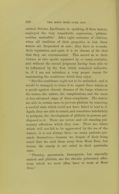 Credit: On the Mont Dore cure and the proper way to use it : in the rheumatic, gouty, scrofulous, syphilitic, tuberculous, dartrous, and other morbid constitutional states; also in asthma, consumption, bronchitis, emphysema, naso-pulmonary catarrh, and other affections of the throat, chest and mucous membranes / by Horace Dobell. Source: Wellcome Collection.