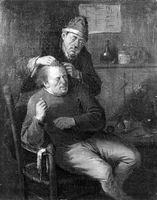 M0018244: A barber or barber surgeon lancing a boil on a man's forehead, oil painting. In copyright. Source: Wellcome Collection.