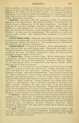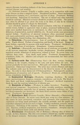 ![headacHe, etc. Treatment: Sulphate of zinc, or some other emetic; stomach- pump. [One-per-cent. solution of permanganate of potassium.—V.] Tan- nin. Cafe noir. Atropine may be tried as a physiological antidote. Stimu- lants (camphor, ether) are best, also cold baths with shower-baths; arti- ficial respiration. 2. Chronic (morphine habit) : Emaciation, ansemia, headache, vertigo, wakefulness. Tremor. Mental disturbance. Unconquerable longing for morphine; and, if this be denied, the appearance of grave symptoms. To break up the morphine habit is almost impossible except in hospitals and special asy- lums. The withdrawal of the drug is abrupt according to the practice of some, and gradual according to others. Eor particulars consult monographs. 32. Ergot (Ergotine).—1. Acute: At first nausea, vomiting, colic, and diar- rhoea. Then vertigo, headache, and muscular weakness. Pulse slow. In severe cases, sopor, disturbance of respiration, and sometimes death. Treatment: Emet- ics and purgatives. Tannin. Ether, camphor, and cafe noir as stinaulants. 2, Chronic ergotism: Gastric symptoms, vertigo, languor, cardiac weakness. The nervous disturbances are, however, of especial importance. Of these, parsesthesia has long been recognized. Recently attention has been attracted to the great resemblance of the nervous symptoms to those of tabes dorsalis; and there is, moreover, an anatomical change in the posterior columns of the cord. Convul- sions and psychical phenomena are also observed. A second form of chronic ergotism is called gangrenous ergotism. It results in dry gangrene of the hands and feet. A line of demarcation forms and the gangrenous parts slough off. The process may be attended by fever and pysemia. The probable explanation is that the minute blood-vessels become spasmodically contracted and thrombi form under the influence of the poison. The different symptoms are due in part to the different constituents of the ergot. The best known are sphacelinic acid, which is probably the cause of g-angrenous ergotism and ergotine tabes; cornutine, which causes severe convulsive symptoms (convulsive ergotism) and uterine contrac- tions; and finally ergotinic acid. The treatment of chronic ergotism is purely symptomatic. 33. Poisonous Mushrooms.—1. Poisoning from morels: Fresh morels (mor- eheln or lorcheln ) contain a poison which is readily soluble in hot water, and which evaporates completely if the morels be dried. Morels that have been dried or parboiled are therefore perfectly harmless, but the fresh ones are poisonous. The symptoms are nausea, vomiting, diarrhcea, headache, coma, and, above all, haemoglobingemia and hsemoglobinuria (q. v.), associated with which is a hsematogenous icterus. In severe cases death occurs, ushered in by convulsions. Treatment is symptomatic, and includes the administration of emetics, purga- tives, and stimulants. 2. Poisoning from the red agaric (amanita muscaria). This contains the poisonous alkaloid muscarine. Gastric symptoms and diar- rhoea. Mental excitement, delirium, tetanic and epileptiform convulsions. A rapid pulse, small pupils, disturbed vision from spasm of accommodation, sweat- ing, salivation, and in most of the severe cases sopor and death. Treatment: Emetics, etc. Atropine, which acts as a physiological antidote to muscarine. Also tannin, and stimulants. 3. Poisoning from hulhous mushrooms (ama- nita phalloides), confused with young button mushrooms (champignons). Di- gestive disturbances, later jaundice, somnolence, coma. The autopsy shows fatty degeneration of the liver, kidneys, and stomach, as in phosphorus poisoning. 34. Poisoning from Sausages (BotuUsmus).—This sometimes occurs as the result of eating partially decayed sausages. The symptoms are pain in the stom- ach, nausea, vomiting, colic, and diarrhoea. There are also marked feebleness, prsecordial anxiety, and dyspnoea; vertigo, headache, somnolence; and very often disturbance of vision (amblyopia, spots before the eyes), and, what is surprising, ptosis. In severe cases, dysphagia, as a result of more or less complete paralysis-](https://iiif.wellcomecollection.org/image/b21206296_1242.jp2/full/800%2C/0/default.jpg)