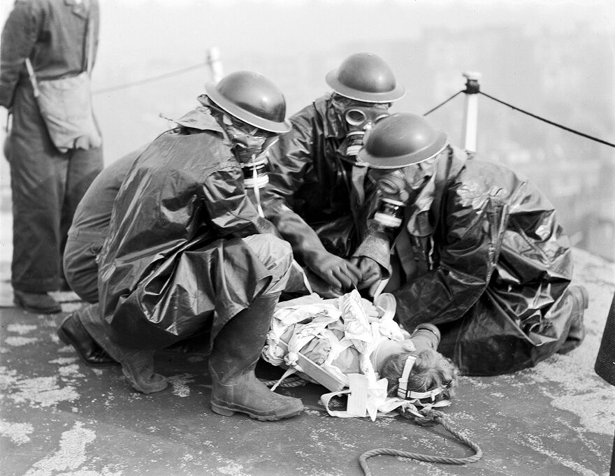 Credit: M0007684: Air raid practice on the roof of the Wellcome Research Institute building. Source: Wellcome Collection.