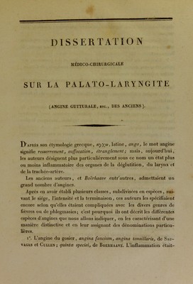 Credit: Dissertation médico-chirurgicale sur la palato-laryngite (angine gutturale, etc., des anciens) : présentée et soutenue à la Faculté de Médecine de Paris, le 24 décembre 1827 ... / par Michel-Victor Guigrand. Source: Wellcome Collection.