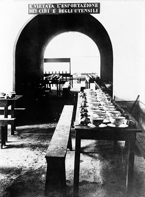 Credit: M0020124: Interior view of an Italian refectory with a sign prohibiting the taking out of food or utensils. Source: Wellcome Collection.