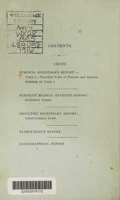 Credit: Reports of the Surgical Registrar, Resident Medical Officer, Obstetrical Registrar, Pathologist and Radiographer : 1916 / North London or University College Hospital. Source: Wellcome Collection.