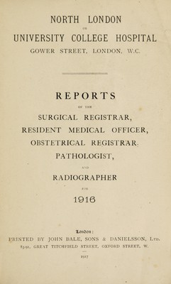 Reports of the Surgical Registrar, Resident Medical Officer, Obstetrical Registrar, Pathologist and Radiographer : 1916 / North London or University College Hospital.