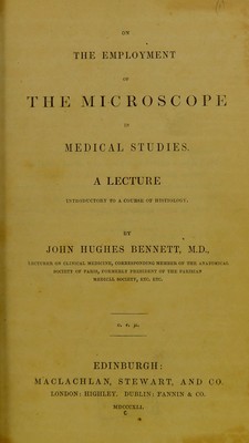On the employment of the microscope in medical studies : a lecture introductory to a course of histiology / by John Hughes Bennett.
