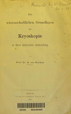 Die wissenschaftlichen Grundlagen der Kryoskopie in ihrer klinischen Anwendung / von A. von Korányi.