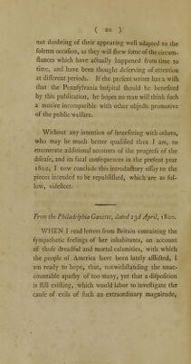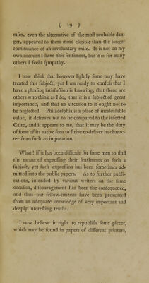 Interesting essays, chiefly on the subject of the yellow fever : interspersed with some remarks on the progress of the preparations for a permanent bridge : and occasionally containing a few observations, relative to the great cause of general humanity / by a Philadelphian ; addressed to those of all classes, who without any improper prejudices, are willing to see, that subjects of great importance may be treated of with all due attention to truth ; and even with respectful consideration in regard to those, whoever they may be, who on some occasions have expressed a difference of sentiment.
