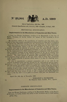 Credit: Improvements in the manufacture of cosmetics and skin tonics / [Carl Von Huber]. Source: Wellcome Collection.