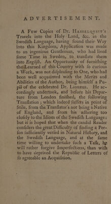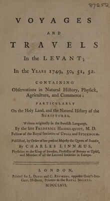 Voyages and travels in the Levant; in the years 1749, 50, 51, 52. Containing observations in natural history, physick, agriculture, and commerce: particularly on the Holy Land, and the natural history of the Scriptures / Written originally in the Swedish language. By the late Frederick Hasselquist ... Published ... by Charles Linnaeus. [With 'Some account of Dr. H., written by C. Linnaeus'].