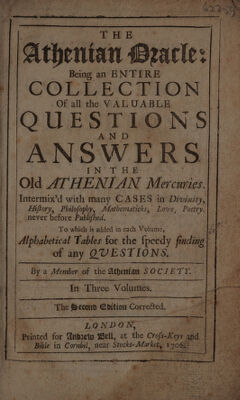 The Athenian oracle: being an entire collection of all the valuable questions and answers in the old Athenian Mercuries ... / By a member of the Athenian Society [S. Wesley].