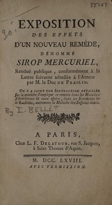 Exposition des effets d'un nouveau remède, dénommé sirop mercuriel / Renduë publique, conformément à la lettre suivante adressée à l'auteur par M. le duc de Praslin. On y a joint une instruction détaillée sur la manière d'employer ce remède dans les maladies vénériennes de toute espèce, dans les ecroüelles et le rachitis, autrement la maladie des enfants noüés. [Anon].