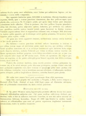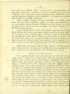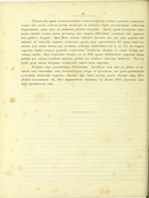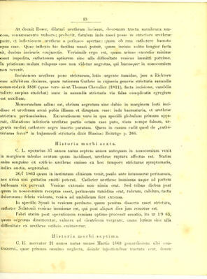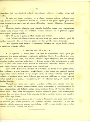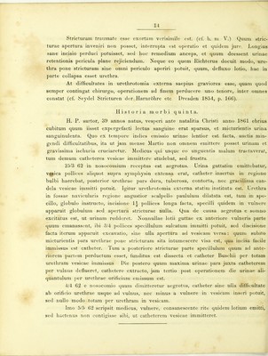 ![quantulum lotii sanguinolenti defluxit extractoque cathetere paululum urinae pel- lucidae. In cathetere quam longissime in urethram immisso incisura pollicem longa facta, caverna pomi magnitudinis reperta est, cruoris et lotii plena. Quae quum esset eluta haemorrhagia exorta est, ad quam inhibendam vulneris dilatatione ligaturisque opus erat. Urethrae funditus abruptae pars vesicalis forcipibus quum esset coraprehensa, :atheter satis crassus totam per urethram vesicae immissus est et perinaeo aegroti lecto impositi glacies adhibita. 13/5 60 Scroti et perinaei intumescentia jam evanuit. 14/5 Cathetere ob blennorrhoeam extracto urina per vulnus defluxit, quod 8/6 Dmnino consanuit. Quo ex tempore quum candelae quotidie essent immissae, 26/6 aegrotus plane sanatus e nosocomio diraissus est, neque hodie quidem n pristinum relapsus malum. Historiamorbi quarta. F. Lt. agricola, 41 annos natus 21/8 1860 in nosocomium venit, quum per ][uindecim jam annos stricturae symptomatis subjectus fuisset. Gonorrhoea sese nun- :juam aifectum fuisse dixit, bis autem, tempore aliquo interposito, non ita parvara sanguinis copiam cum lotio defluxisse, et denique mense Julio indurationem in peri- naeo exortara esse, quara frustra balneis et hirudinibus tractasset raedicus: et paulo 3ost, turaore inciso, lotiuui emanasse sanie commixtum. 21/8 1860. Perinaeura tumidura et induratura; in dextra raphes parte fistula, duo centiraetra a parte posteriore scroti distans, e qua, corapresso perinaei turaore aliquantulura urinae defluxit. Neque longius quani ad partem bulbosam inseri potuit satheter — quamvis urina lente deflueret per urethrae orificium —, neque insertus sentiri potuit, sive a perinaeo quaerebatur, sive ab intestino recto, sive specillo per fistulara iuimisso. Chloroforniio quum esset sopitus aegrotus, urethrotomia externa facta est: catheter usque ad partem membranaceam quum processisset, e sacculo quodara, ut puto, aliquantulura lotii defluxit: nullus enim, iucisione facta, ad vesicara aditus in- veniri potuit. Qua irrita investigatione nimiura temporis quum esset consuraptum, postero die, operatione iterum facta, angusta stricturae apertura reperta est, specillu- lique sulcati ope dissecta. Secundo post operationem die ob urethrae blennorrhoeam quum esset extrac- tus catheter, jam urinae paululum per urethrae orificium eraittebatur. A die 2/11 quotidie catheter argenteus vesicae imraittebatur, et 11/11 quum dimitteretur aegrotus, urinam rite emisit, vulnere fere sanato.](https://iiif.wellcomecollection.org/image/b21474412_0015.jp2/full/800%2C/0/default.jpg)