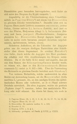 ![— /396 — der heutigen Heilkunde, wegen des in ihren schleimigen Häuten enthaltenen harntreibenden Scillitin, als ein pro- bates Mittel gegen die Wassersucht, und es wird er- zählt, dass man dem heilkräftigen „Auge des Typhon zu Ehren sogar einen Tempel in Pelusium errichtet habe. Über ihre Verwendung sagt Pinius: „Man nimmt die äusseren trockenen Schalen ab, schneidet den übrigen saftigen Teil in Stücke und hängt sie in massiger Entfernung an Fäden auf. Wenn sie trocken sind, werden sie hängend in ein Gefäss, das mit scharfem Essig angefüllt ist, eingetaucht, ohne das Gefäss zu berühren. Dies geschieht 48 Tage vor der Sonnen- . wende. Dann wird das Gefäss mit Gips zugemacht und ver- strichen und unter ein Ziegeldach gesetzt, das den ganzen Tag von der Sonne beschienen wird. Nach der genannten Zahl von Tagen nimmt man das Gefäss von der Stelle, nimmt die Meerzwiebeln heraus und filtriert den Essig. Es folgt nun eine Aufzählung von Krankheiten, gegen welche die die Meerzwiebel mit Nutzen zu gebrauchen ist, so gegen Augenkrankheiten, Wassersucht, Milzkrankheiten, Magenbe- schwerden, Zahnweh, Schlangenbiss u. s. w. NachPytha- goras muss man Meerzwiebeln an der Thür aufhängen, um gegen Zauber gefeit zu sein.^j ImHerapollo ist auch des bekannten Frauenhaars (Adiantum capillus Yeneris L.), einer sehr verbreiteren Farn- art, als Mittel gegen die Bräune gedacht.^) Der Anwendung des Feigenpflasters gegen Ge- schwüre und Pestbeulen ist schon oben Erwähnung gethan.^) Vom aegyptischen Stratiotes, das nur in den Gegen- den wachsen soll, die vom Nil überschwemmt werden, rühmt Plinius, dass die Blätter, mit Essig aufgelegt, Wunden^ Rose und Eiterschäden heilen.^) 1) Plinius XX, 39. 2) Herapollo: Hierogljph. II, c. 93, p. ]26. 2) Vergl. Plinius XXIII, 63. Dioscorides I, 183. 4) Phnius XXIV, 105.](https://iiif.wellcomecollection.org/image/b21084828_0390.jp2/full/800%2C/0/default.jpg)