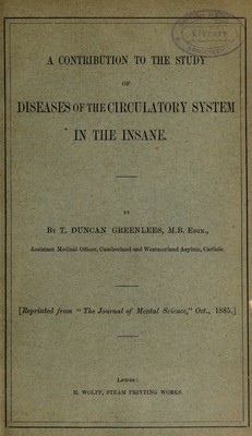 A contribution to the study of diseases of the circulatory system in the insane / by T. Duncan Greenlees.