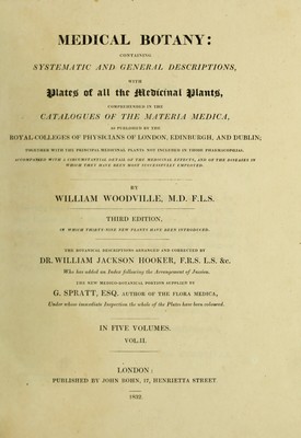 Medical botany : containing systematic and general descriptions, with plates of all the medicinal plants comprehended in the catalogues of the materia medica as published by the Royal Colleges of Physicians of London, Edinburgh, and Dublin ..., / by William Woodville.