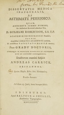 Credit: Dissertatio medica inauguralis de asthmate periodico / [Andrew Carrick]. Source: Wellcome Collection.