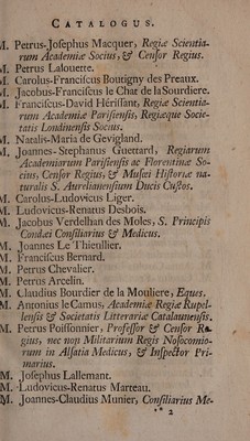 ![CATEOG OU S. A. Petrus-Jofephus Macquer, Regie Scientia- rum. Academic Socius , eg Cei]or Regius. f. Petrus Lalouette. i (4. Carolus-Francifcus Boutigny des Preaux. |. Jacobus-Francifcus le Chat de laSourdiere. f. Francifcus-David Hériffant, Regie Scientia- rum Academie Pavifienfis, Regizeque Socie- tatis Londinenfis Socius. | | f. Natalis-Maria de Gevigland. 4, Joannes-Stephanus Guettard, Regiarum Academiarumn Parifieufis ac. Florentie So- cius, Cenfor Regius, €? Mu]ei Hiflorue na- turalis S. Aureliauenfium Ducis Cuftos. M. Carolus-Ludovicus Liger. iG M. Ludovicus-Renatus Desbois. M. Jacobus Verdelhan des Moles; S. Principis Condei Confiliarius €? Medicus : M. Joannes Le Thieullier, ! M. Francifcus Bernard. M. Petrus Chevalier. M. Petrus Arcelin. | M. Claudius Bourdier de la Mouliere, Eques. M. Antonius leCamus, Academic Regie Rupel- -. lenfis €? Societatis Litterariee Catalaunenfis. M. Petrus Poiffonnier, Profeffor €? Ceu[or -R&. — gius, mec non Militarium Regis INojocomio- rum in Aljatia Medicus, &9 Infpector Pri- .. Huürius. | | | M. jJofephus Lallemant. : M. -Ludovicus-Renatus Marteau. M. jJoannes-Claudius Munier, Confiliarius Me- T : We S T,](https://iiif.wellcomecollection.org/image/b30521750_0025.jp2/full/800%2C/0/default.jpg)