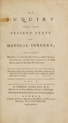 An inquiry into the present state of medical surgery; including the analogy betwixt external and internal disorders; and the inseparability of these branches of the same profession / [Thomas Kirkland].