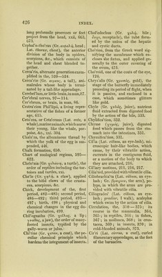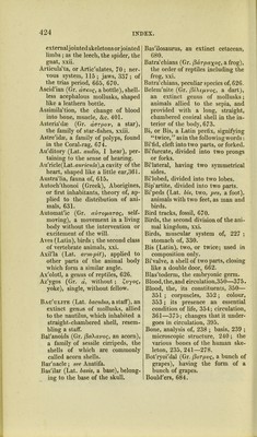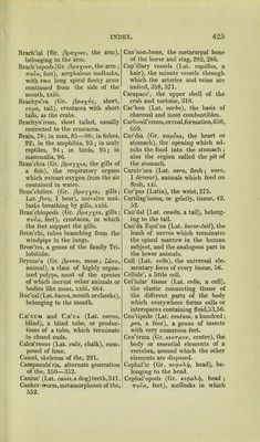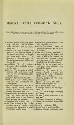 ![GENERAL AND GLOSSARIAL INDEX. I Note.—The Arabic figures refer, not to the pages, but to the numbered sections; the Roman numerals indicate the pages of the Introduction. A, a Greek prefix, signifying gene- rally “ without,” as in Abran- chiata (without gills, /3|Oayxt«)> which see. Abdo'men (Lat. abdo, I conceal), the posterior and principal cavity of the animal, containing the bowels and many other viscera. The abdomen is distinct from the thorax in crustaceans, spiders and insects, 60. Abranchia'ta (Gr. d, without; (3payxia, gills), moUusks devoid of giUs, xxii. Acale'pha (Gr. ciKaXrjtpr], a nettle), radiates with soft skins, which have the property of stinging like a nettle, xxiii. Acale'phae, digestion in the, 315. Ac'arus (Gr. dicapi, a mite), arach- nides, as the cheese-mite and allied species. Aceph'ala, Aceph'alous (Gr. d, with- out; KsdaXrj, head), headless; animals in which a distinct head is never developed, xxii. 662. Acetab'ula (Lat. acetabulum, a shal- low cup), fleshy sucking cups, with which many of the inverte- brate animals are provided. Acetab'ulum, the, in man, 263. Ac'ini (Lat. acinum, a berry), the secreting parts of glands, which are suspended hke grains or small berries to a slender stem. Acotyl'edons, plants without a dis- tinct cotyledon, 69. Acous'tic (Gr. d/covo, I hear), ap- pertaining to sound, or the organ of hearing. Ac'rita (Gr. dicpiTog, confused), a term applied to the lowest ani- mals, in which the organs, and especially the nervous system, were supposed to be confusedly blended with the other tissues. Actin'ia (Gr. Iiktiv, a ray), polyps with many anns radiating from around the mouth. Actino'ceras (Gr. cIktiv, a ray; KEpag, a horn), a generic term signifying the radiated disposition of the horns or feelers. Actin'oids, polyps, as the coral- polyps, xxiii. Adipose' (Lat. adeps, fat), fatty. Affinities and analogies, 16. Ages of nature, 656—690. Air, changes effected in, by respir- ation, 393. A'lar (Lat. ala, a wing), belonging to a wing. Albu'men (Latin), the white of an egg, 446. Albu'minous, consisting of albumen. Al'iform (Lat. aliformis), shaped like a wing. Aliment'ary canal, the, 312. AUmenta'tion, or nutrition, 62. Allan'tois (Greek), a vesicular organ](https://iiif.wellcomecollection.org/image/b21958488_0453.jp2/full/800%2C/0/default.jpg)