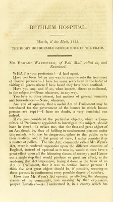 Credit: Report, together with the minutes of evidence, and an appendix of papers, from the committee : appointed to consider of provision being made for the better regulation of madhouses in England (ordered by the House of Commons, to be printed, 11th July, 1815) : each subject of evidence arranged under its distinct head / by J.B. Sharpe. Source: Wellcome Collection.